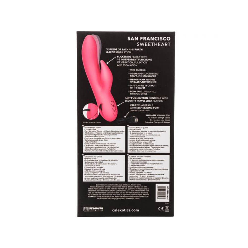 Dive deep into pools of pleasure and sun-kissed fantasies with the playful California Dreaming™ San Francisco Sweetheart. The luxurious vibrating massager has 10 intense vibration functions and 3 back-and-forth G-spot massager speeds for one-of-a-kind pleasure experience. The seamless silicone body and flickering teaser put out knee-shaking stimulation in and out of the water.