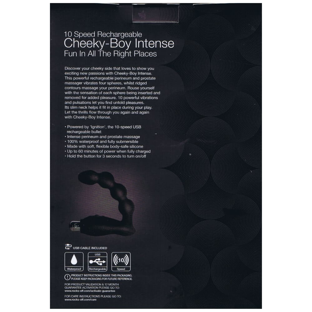 Cheeky-Boy Intense Fun in all the right places Discover your cheeky side that loves to show you exciting new passions with Cheeky-Boy Intense. This powerful rechargeable perineum and prostate massager vibrates four spheres, whilst ridged contours massage your perineum. Rouse yourself with the sensation of each sphere being inserted and removed for added pleasure. 10 powerful vibrations and pulsations let you find untold pleasures. Its slim neck helps it fit in place during your play. Let the thrills flow through you again and again with Cheeky-Boy Intense.